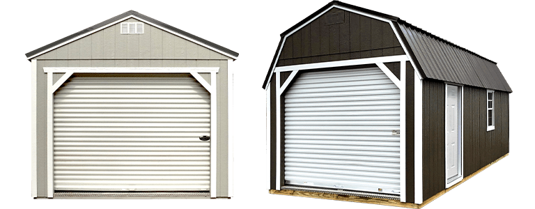 A rollup garage door is ideal for easy-access storage, especially for larger items that need a wide lockable opening. The package also includes a solid walk-in door, one 2x3ft single-pane window, 12in On-Center floor joists, and a diamond plate door threshold. The Utility version includes 8ft walls.
